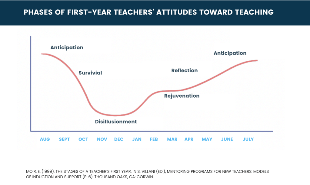 - Disillusionment Phase (November – December): After weeks of nonstop work, it’s common to hit a low point. This phase is marked by questioning one’s competence and commitment to teaching.
