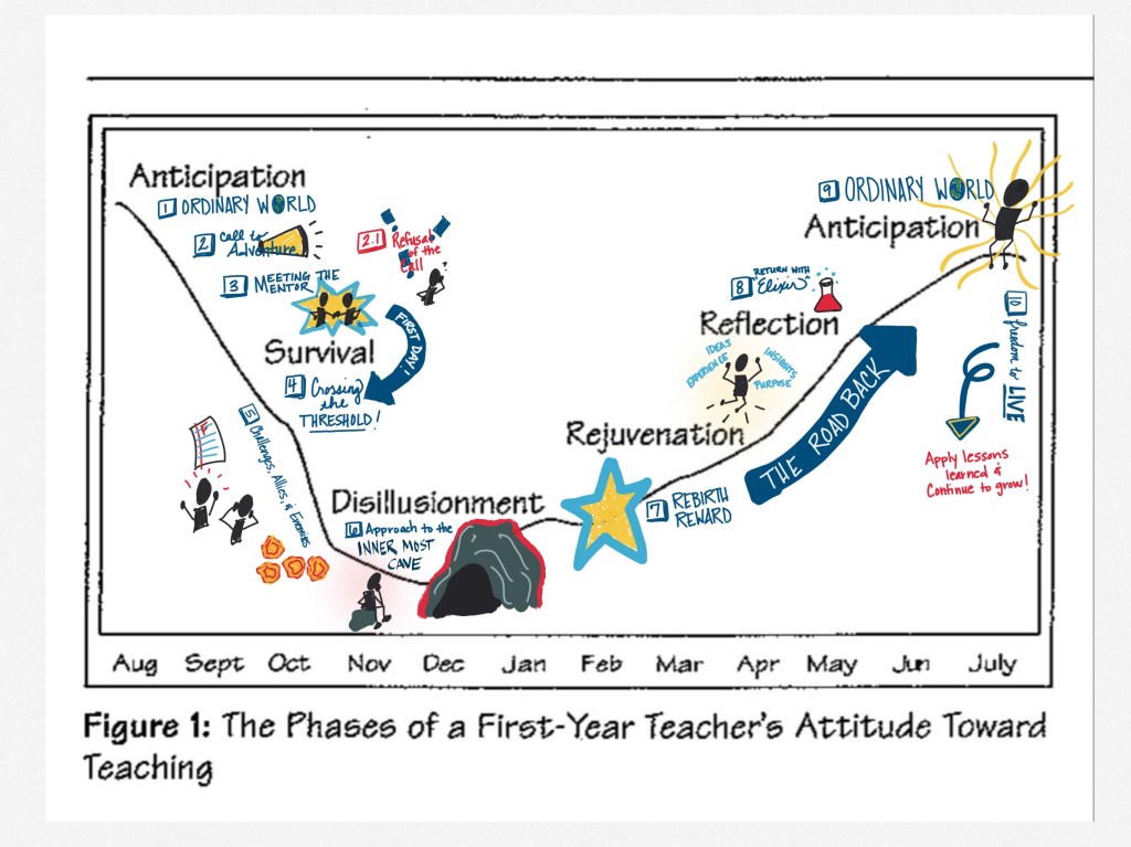 I wondered how I could make the concept of these phases more engaging for new teachers especially the visual. That’s when my English teacher background kicked in, and I realized these phases followed a similar path to Joseph Campbell’s Hero’s Journey. What if we reframed the First-Year Teacher experience as a personal journey? I took the phases for teachers and the stages of the journey and mapped them out as follows: